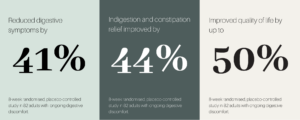 Constipation symptoms improved significantly: up to 43% improvement in the higher-dose group and 23% improvement in the lower dose group, while the placebo group saw no benefit.